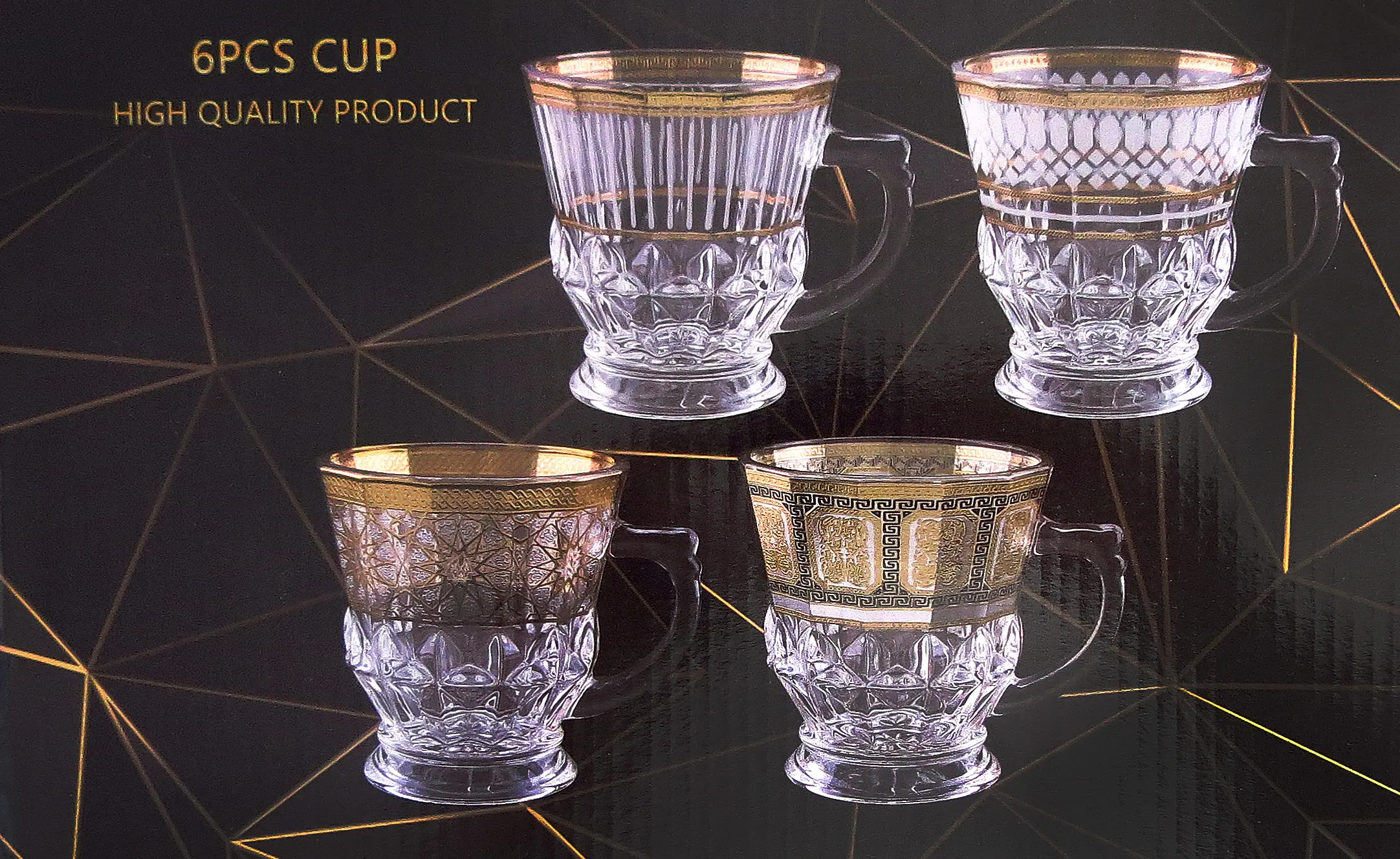 Juego de tazas vidrio estampado dorado x 6 unidades 200 ml en caja regalo 8,5 x 8 cm