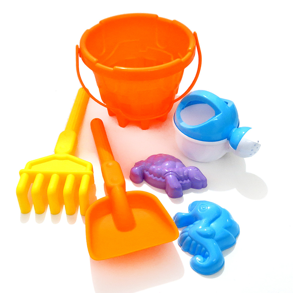 Set Playa balde, pala (15x12cm), rastrillo, moldes, regadera en red 6 pcs