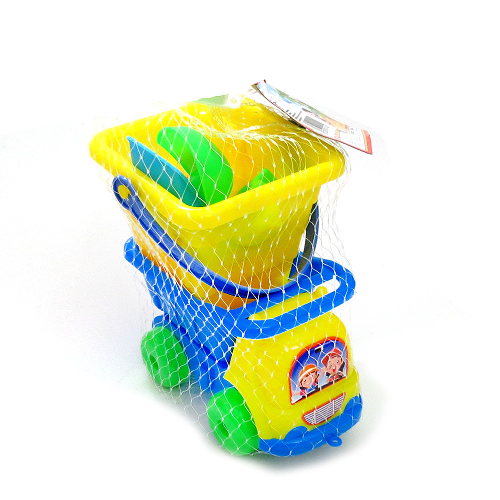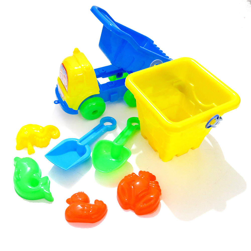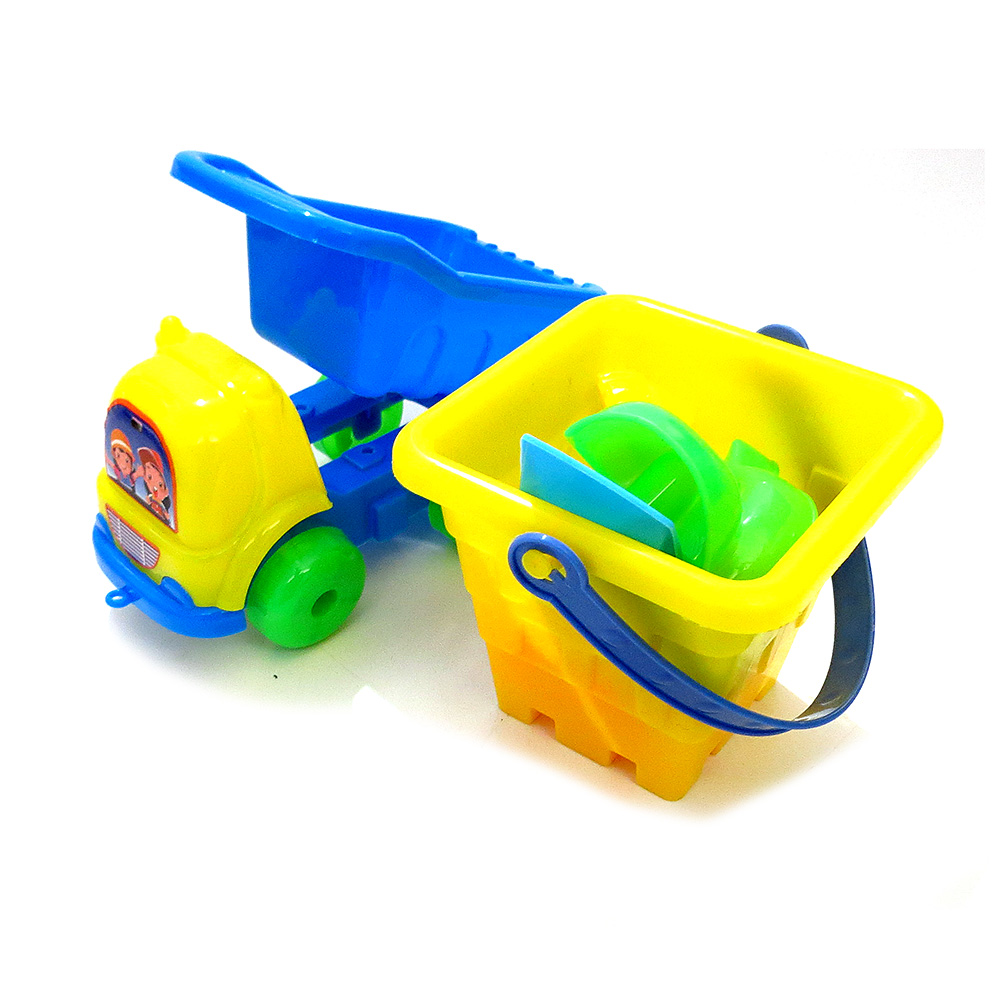 Set Playa camión, balde (10x9cm), 2 palas, 4 moldes en red 8 pcs